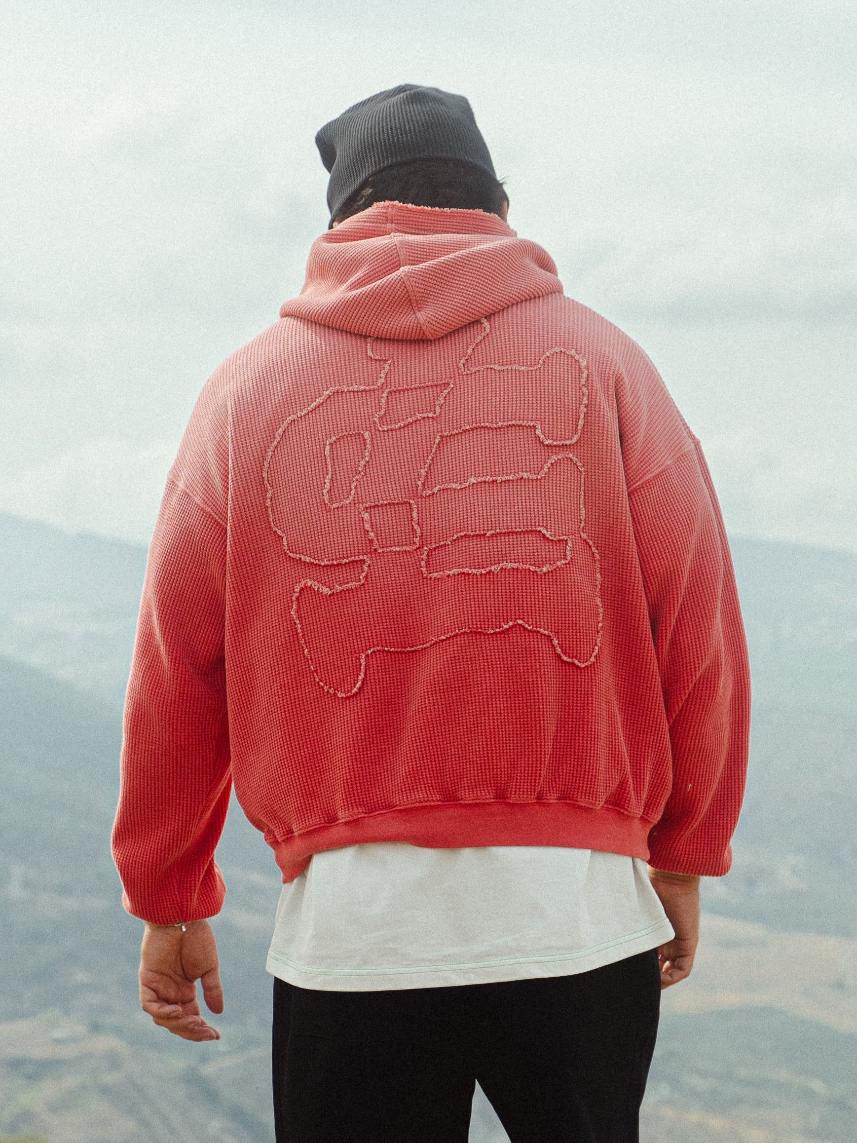 420GSM WAFFLE COTTON. HEAVY, SOFT AND MADE TO BREATHE. GARMENT-DYED FOR A SUN-FADED EFFECT. RELAXED FIT WITH CLEAN RIBBED CUFFS.