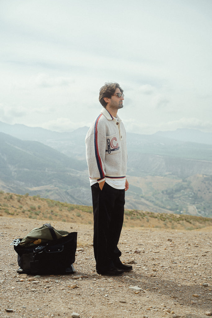 HEAVY WOOL BLEND KNIT WITH ALPACA, MOHAIR, AND NYLON FOR NATURAL INSULATION AND TEXTURE. BUTTON-UP CLOSURE, RIBBED EDGES, AND OLD-SCHOOL ALPINE CHARACTER REIMAGINED FOR THE PRESENT. BOXY FIT.