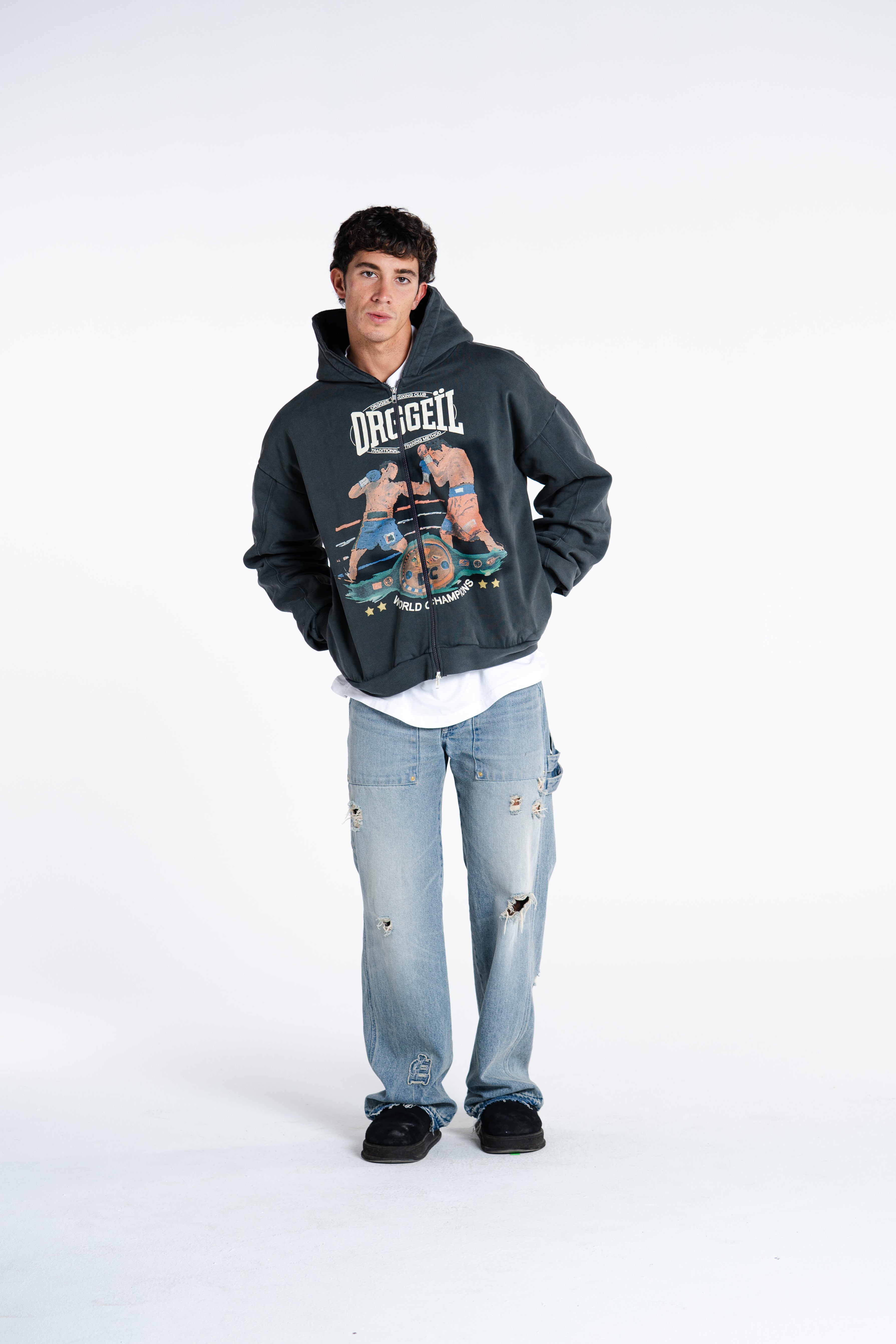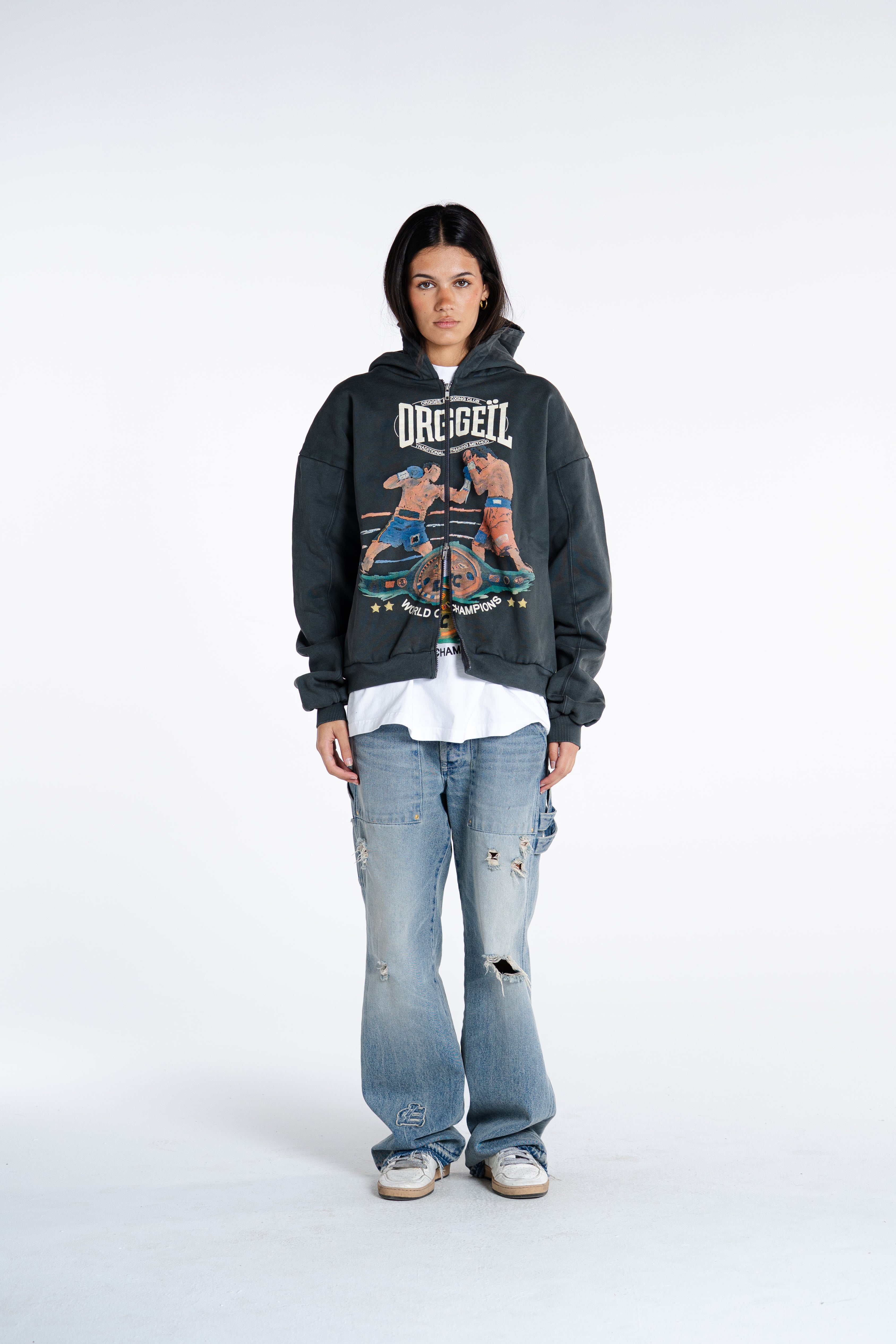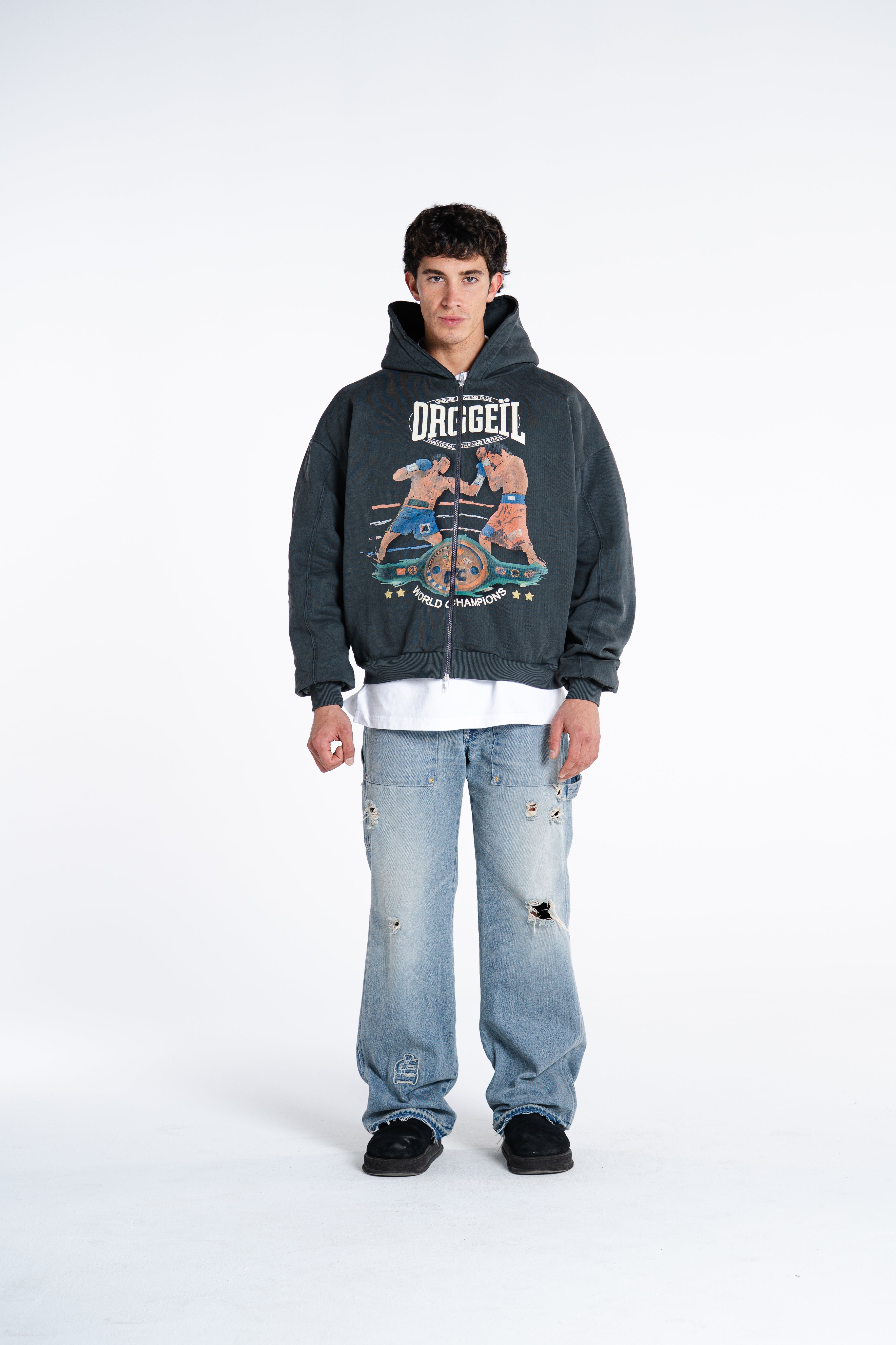 CRAFTED FROM HEAVYWEIGHT COTTON WITH A CLEAN, STRUCTURED FEEL. BUILT AROUND OUR ICONIC LE NOBLE ART GRAPHIC  NOW REWORKED TO MERGE BOXING HERITAGE WITH QUIET-LUXE ATTITUDE. DESIGNED TO BE WORN AS A SET: TEE UNDERNEATH, ZIP UP ON TOP, CONFIDENCE IN EVERY STEP.
