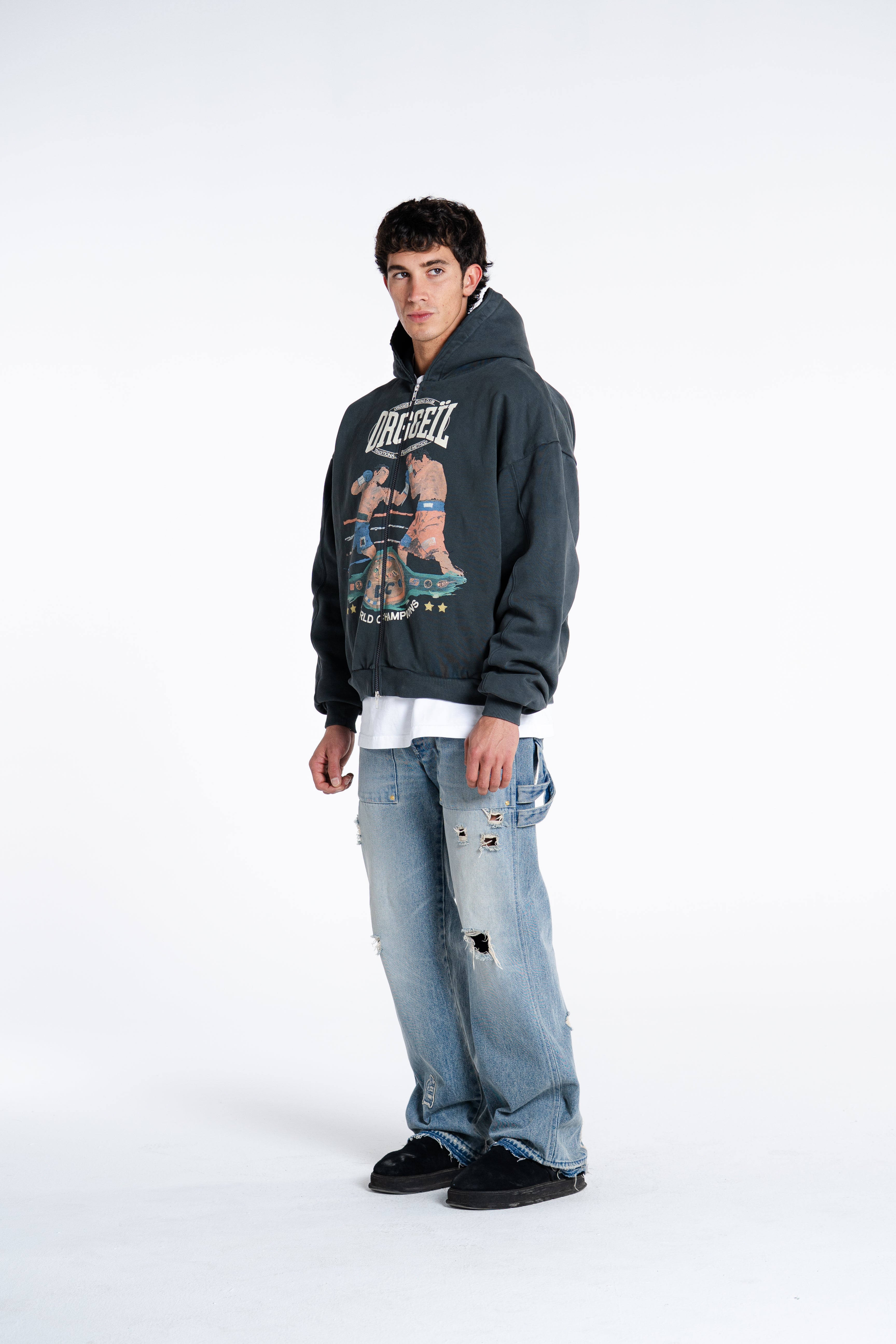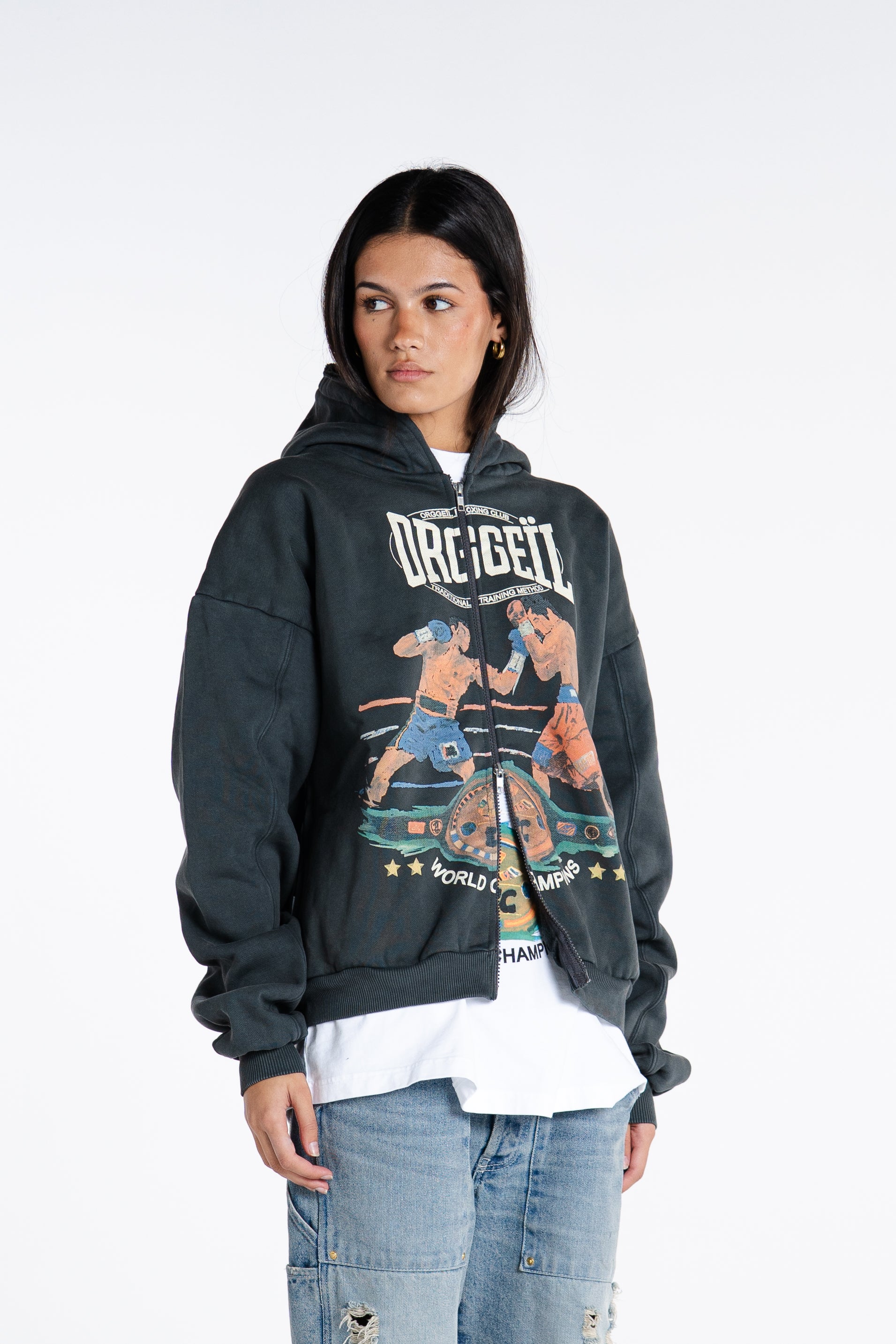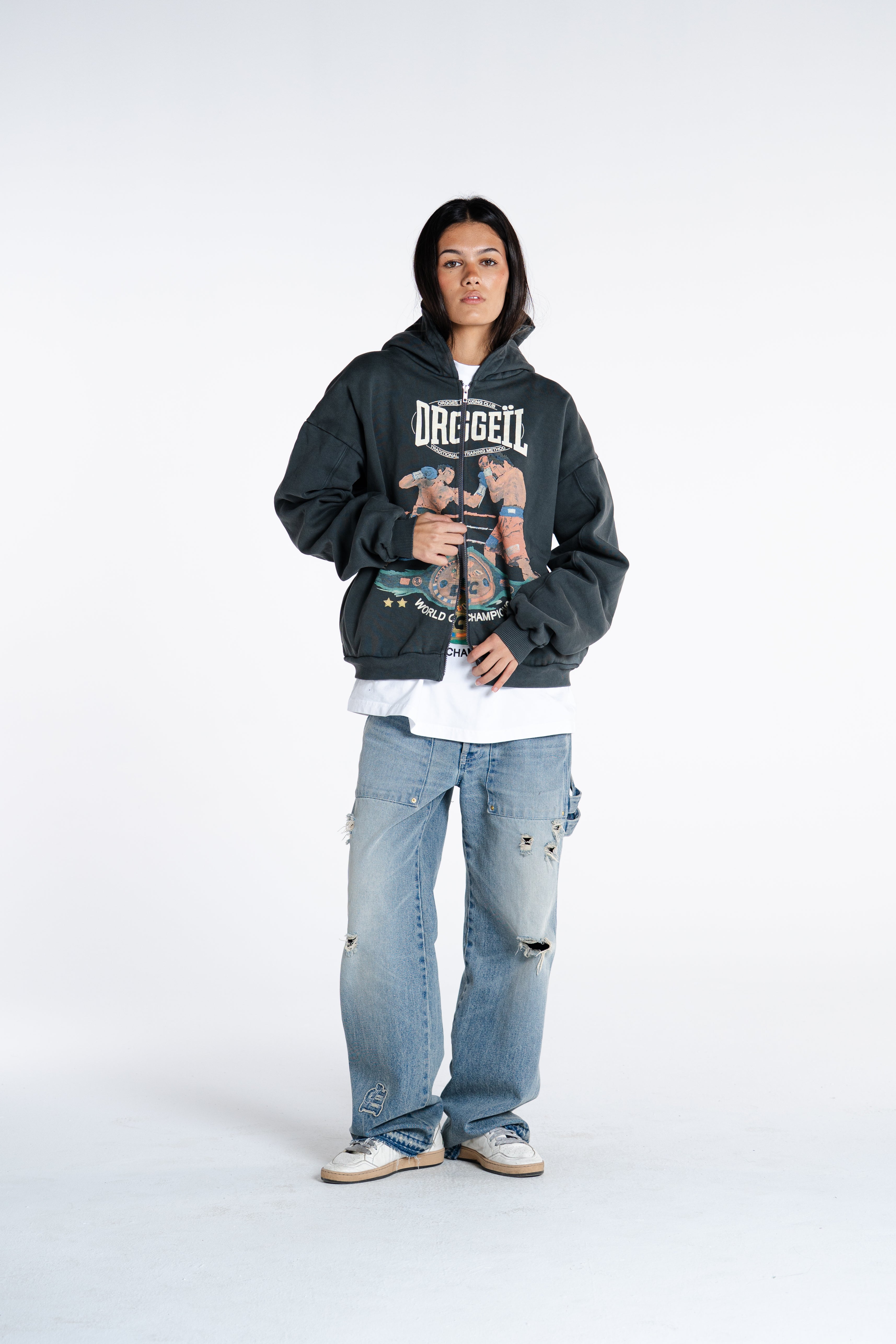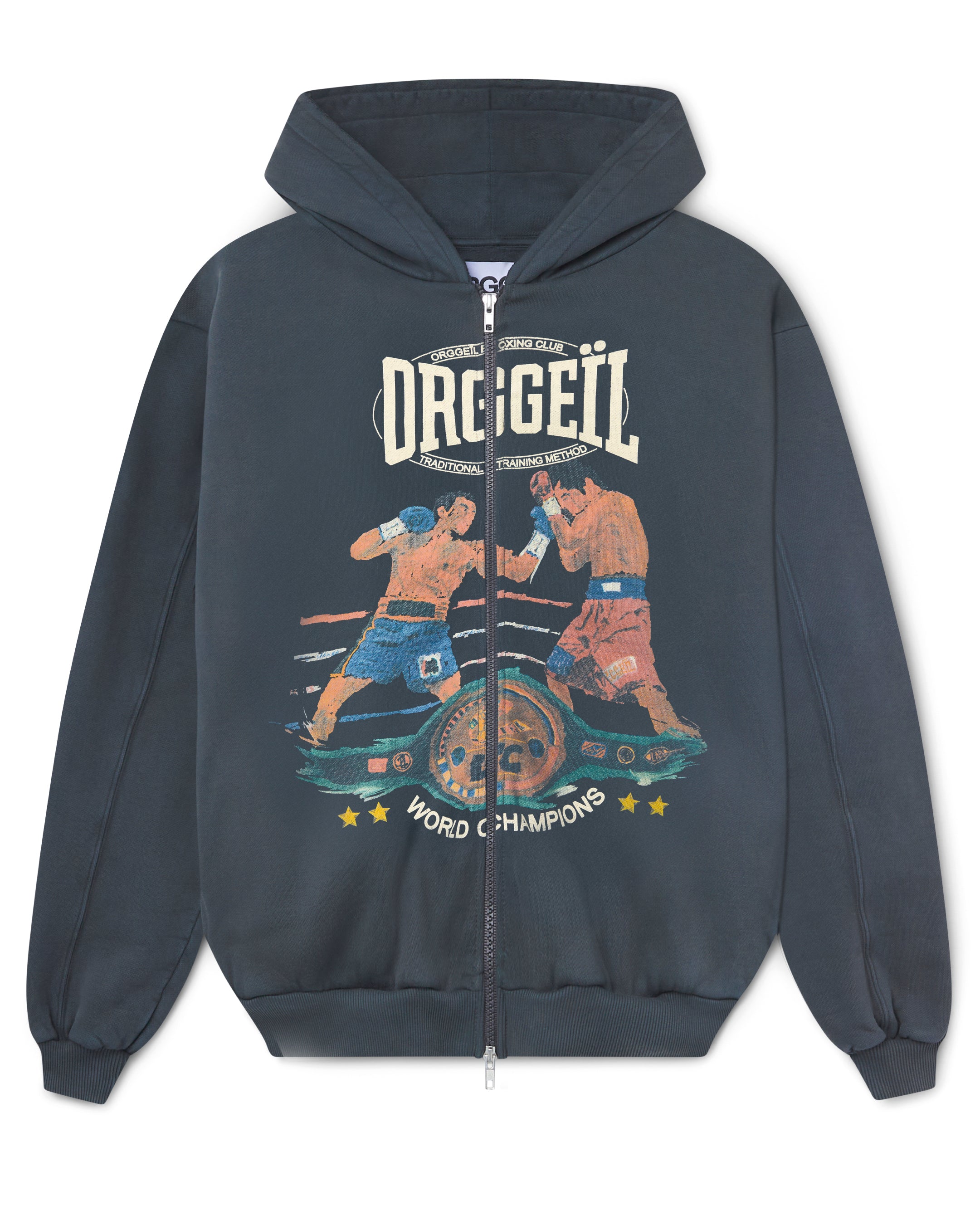 CRAFTED FROM HEAVYWEIGHT COTTON WITH A CLEAN, STRUCTURED FEEL. BUILT AROUND OUR ICONIC LE NOBLE ART GRAPHIC  NOW REWORKED TO MERGE BOXING HERITAGE WITH QUIET-LUXE ATTITUDE. DESIGNED TO BE WORN AS A SET: TEE UNDERNEATH, ZIP UP ON TOP, CONFIDENCE IN EVERY STEP.