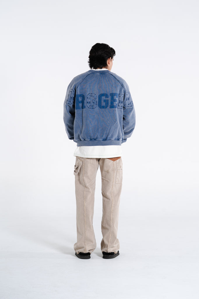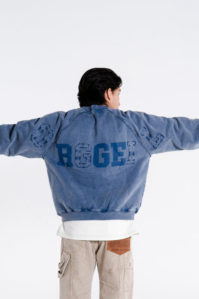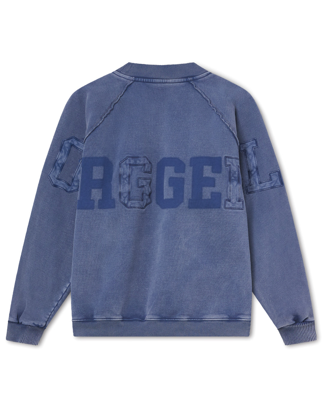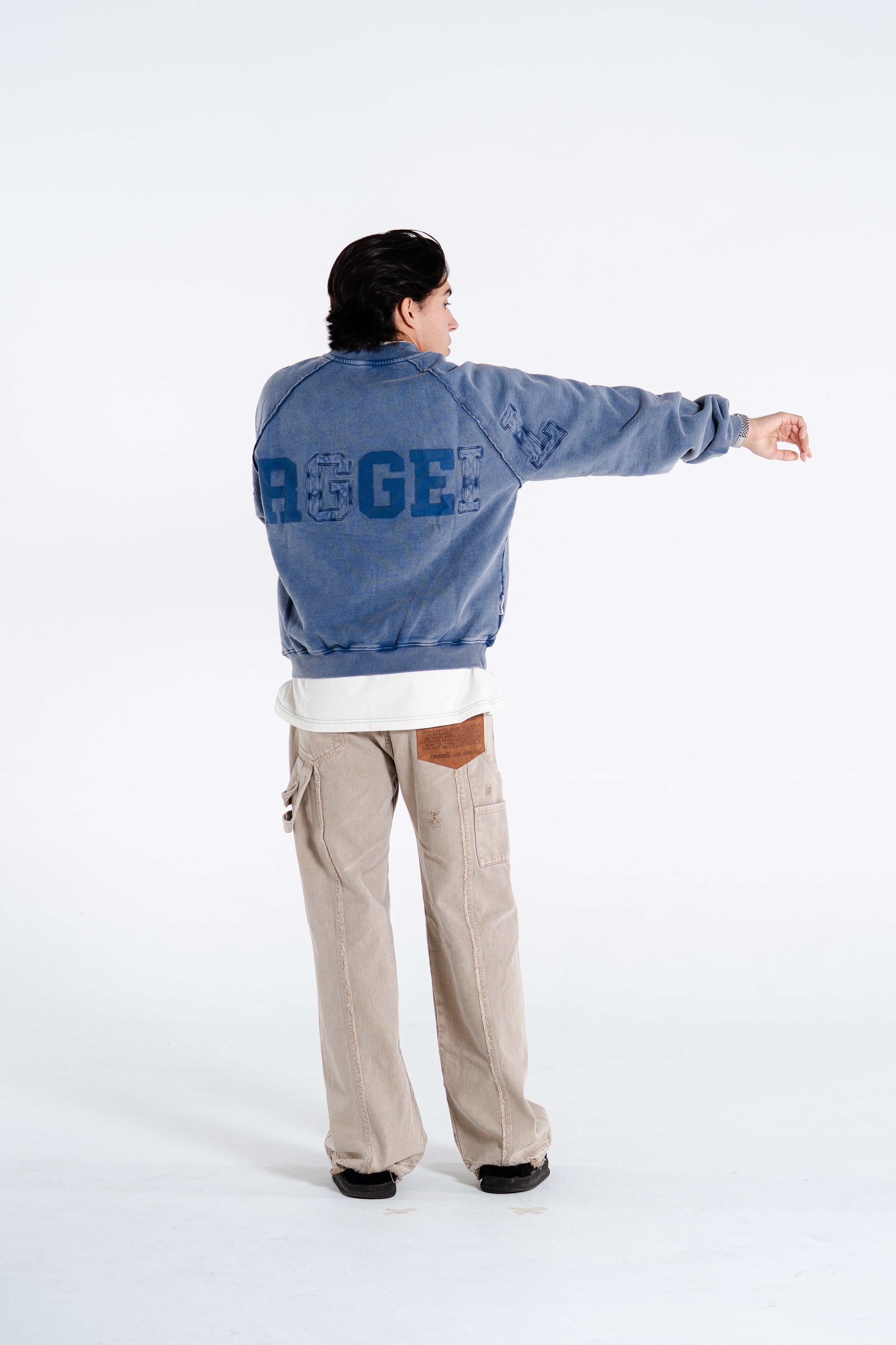 HEAVYWEIGHT COTTON WITH A RAGLAN CUT AND A RAW, CURATED FINISH. THE BACK EMBROIDERY SPELLS ORGGEÏL — SOME LETTERS REMAIN, OTHERS LIFT AFTER WASH, LEAVING A UNIQUE FADED-BLUE TRACE. DISTRESSED BY DESIGN, SELECTIVE BY TASTE.