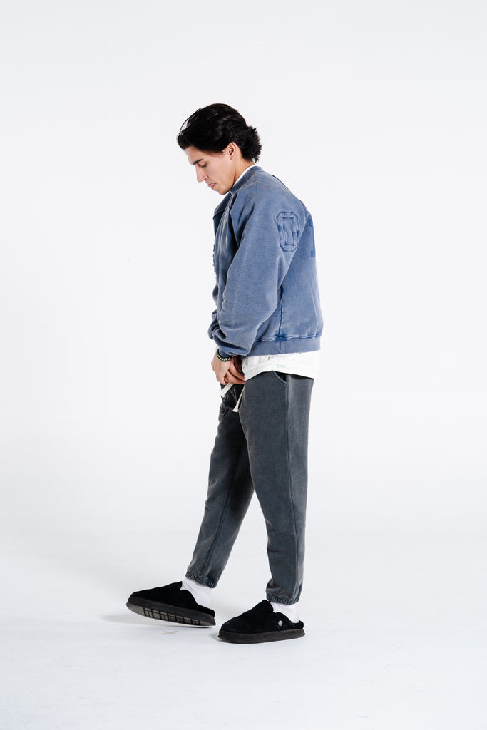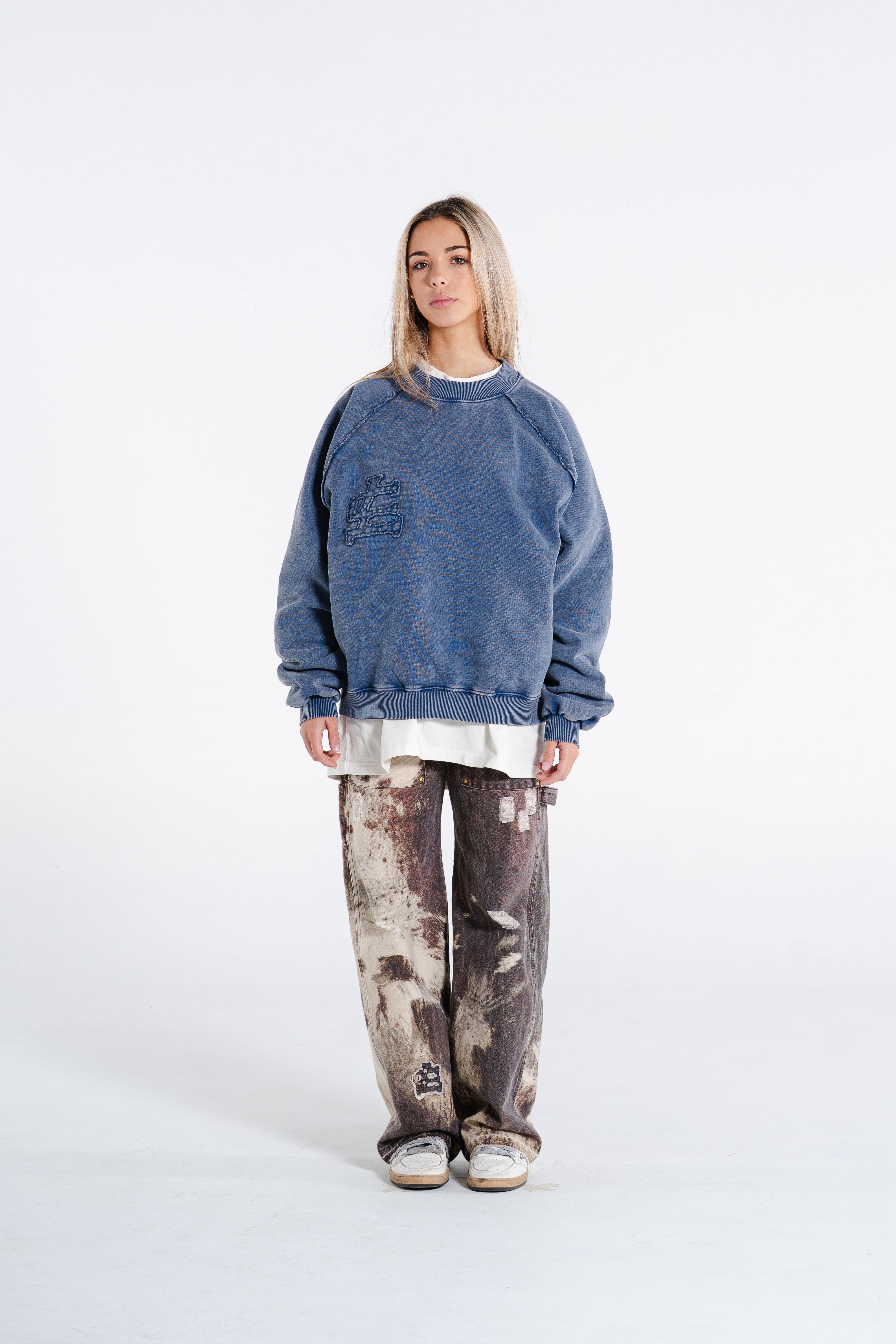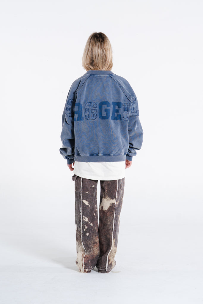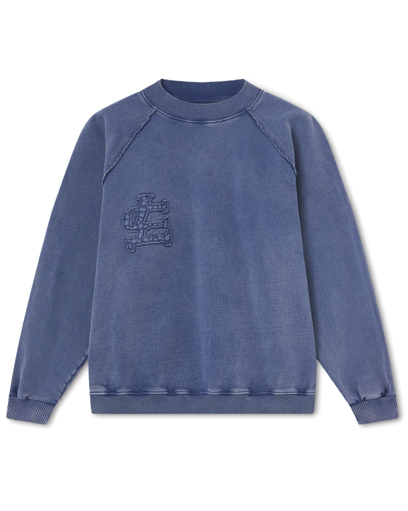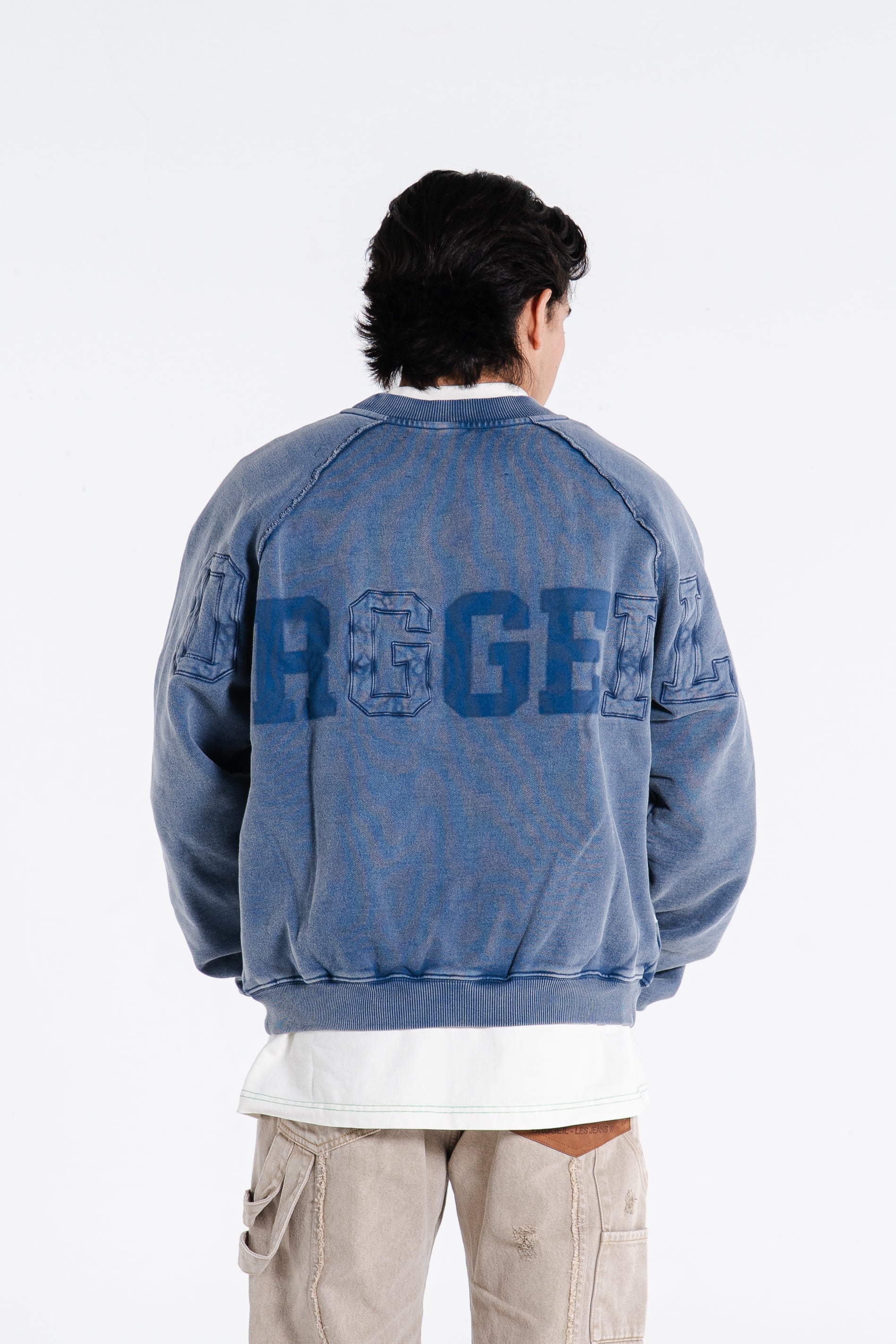 HEAVYWEIGHT COTTON WITH A RAGLAN CUT AND A RAW, CURATED FINISH. THE BACK EMBROIDERY SPELLS ORGGEÏL — SOME LETTERS REMAIN, OTHERS LIFT AFTER WASH, LEAVING A UNIQUE FADED-BLUE TRACE. DISTRESSED BY DESIGN, SELECTIVE BY TASTE.