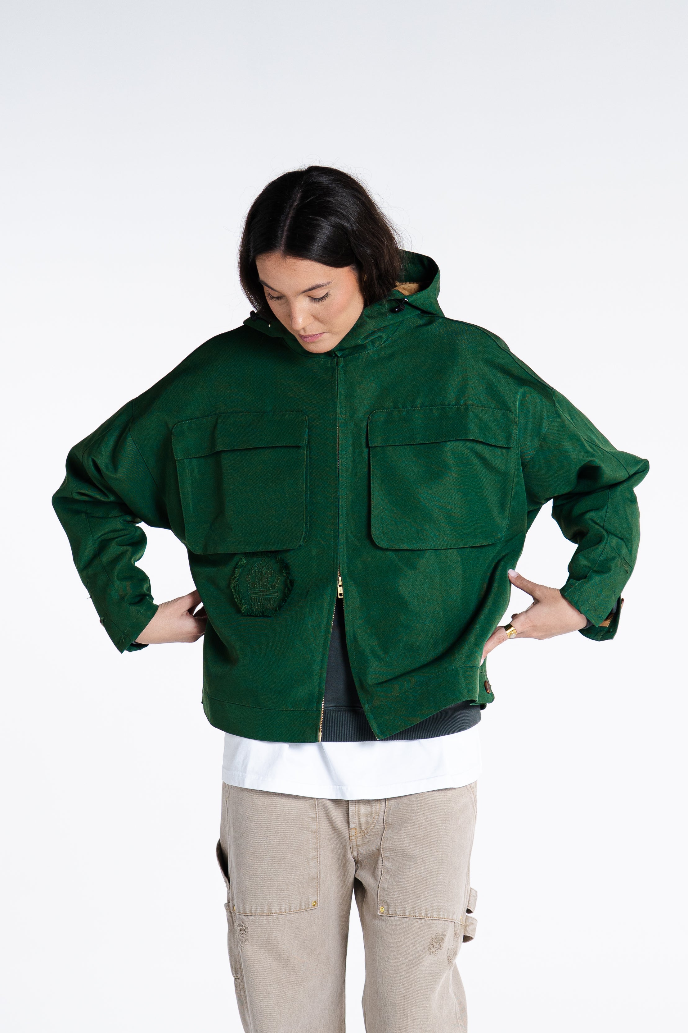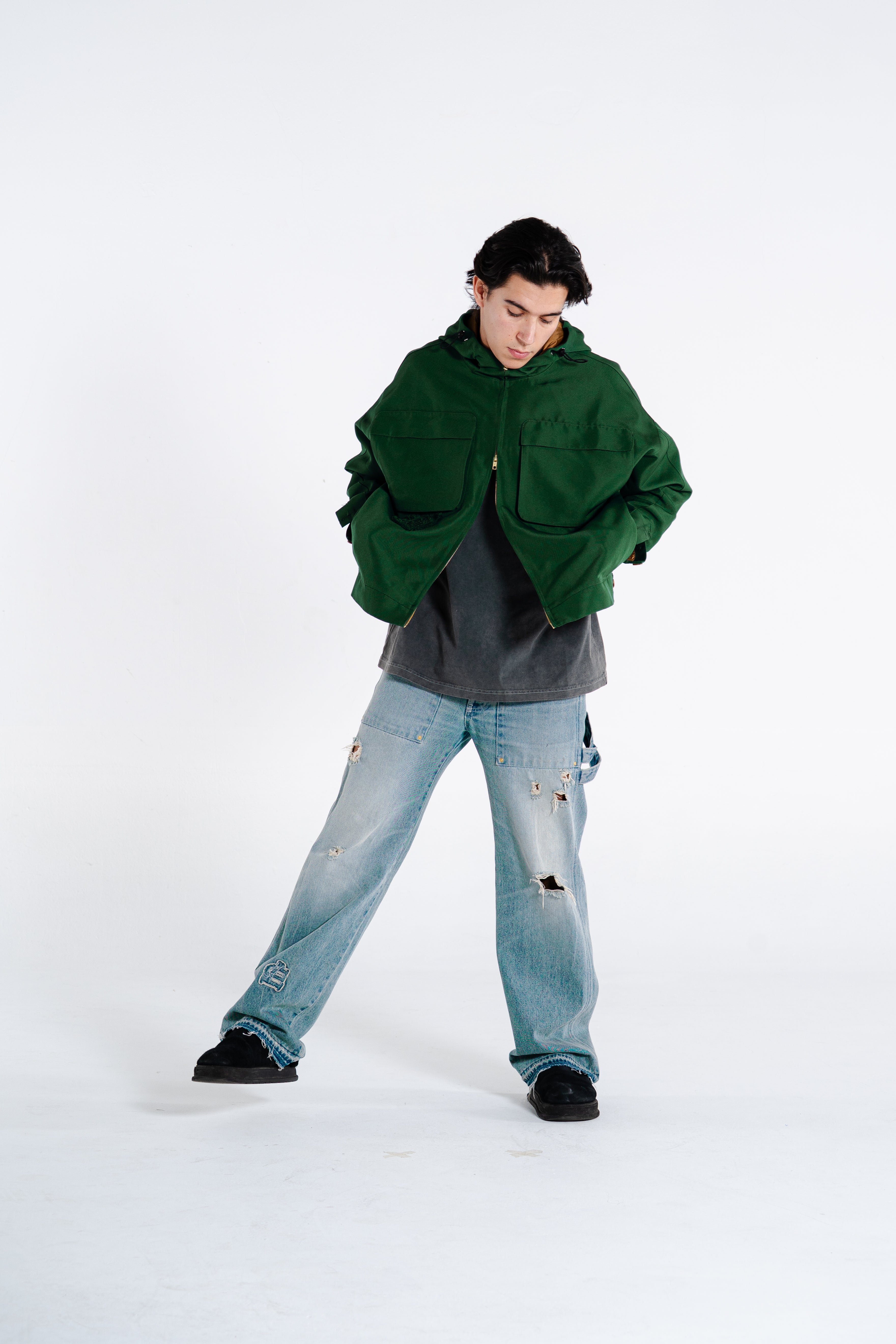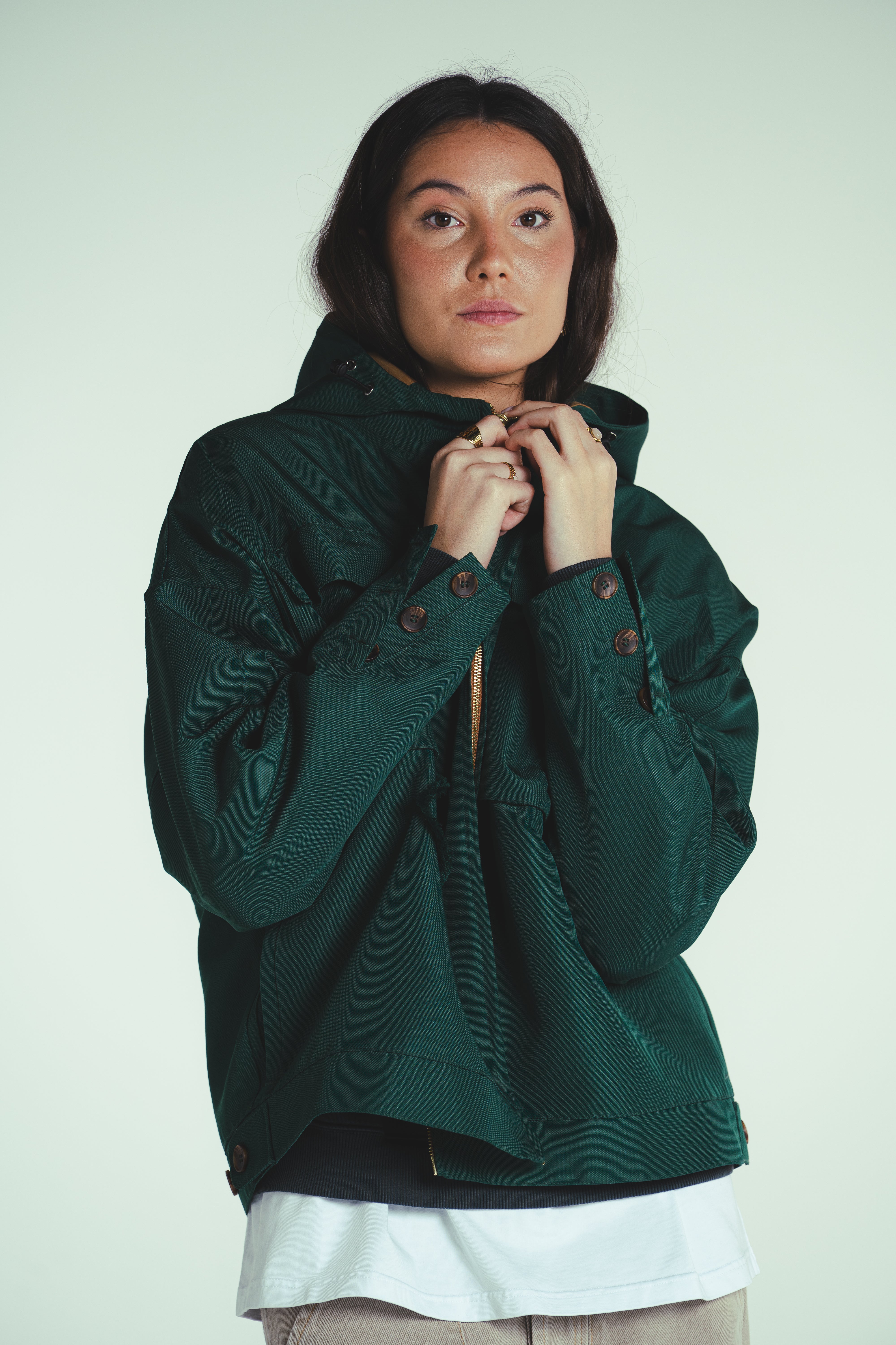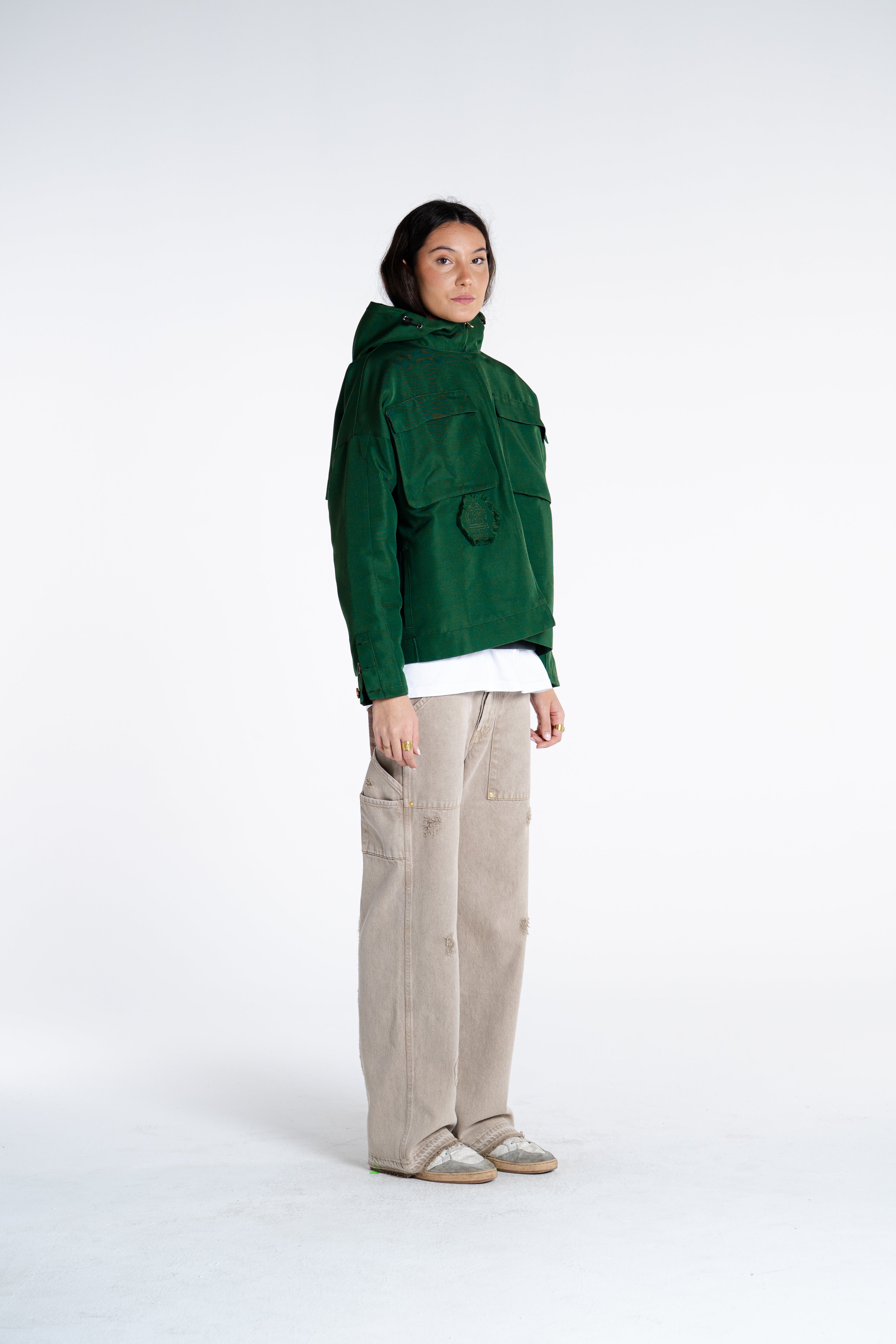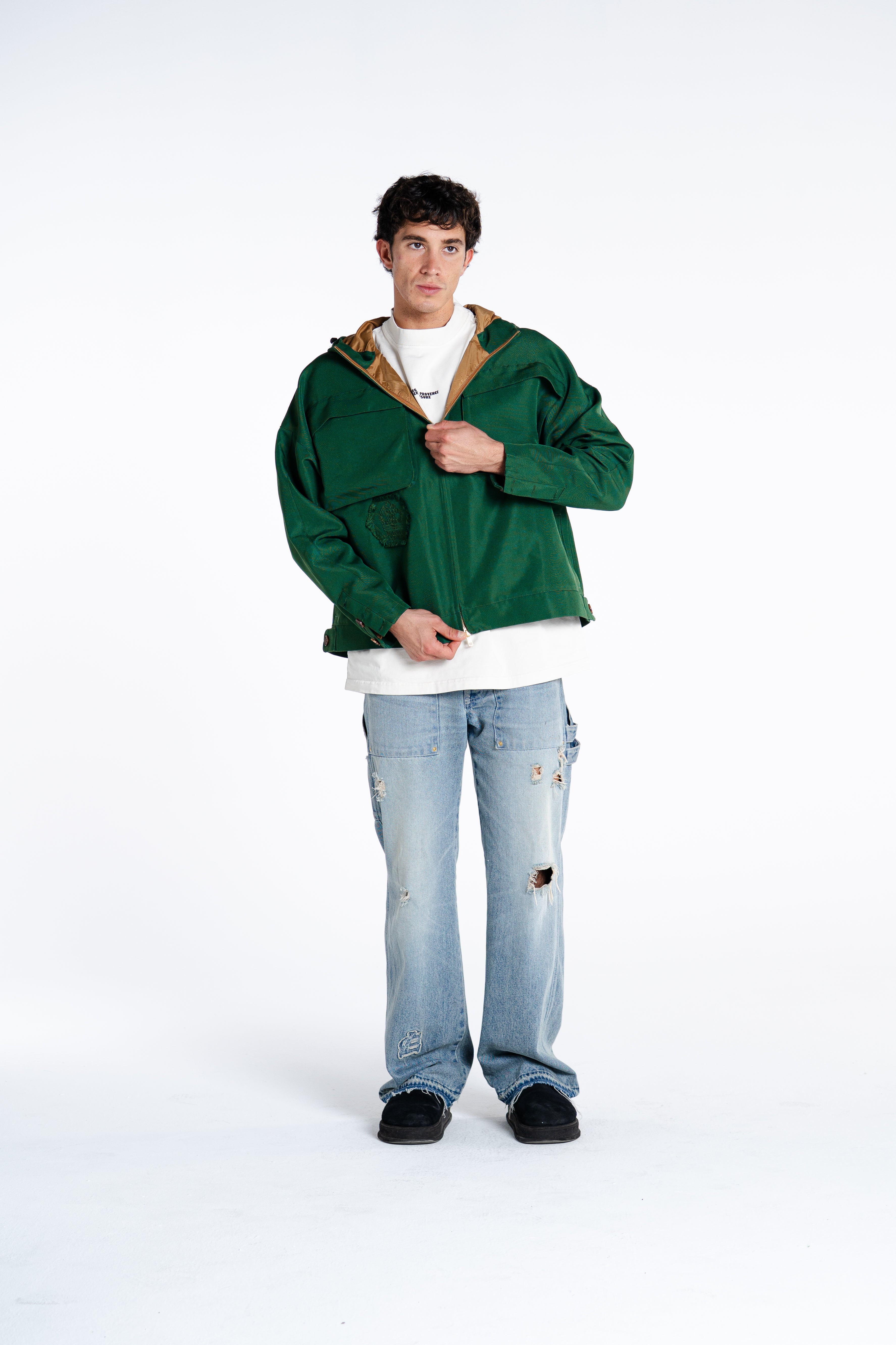 MADE FROM 375GSM DOUBLE-THREAD NYLON WITH A SUBTLE MATTE COATING. WINDPROOF, WATER-RESISTANT, AND BREATHABLE. HIDDEN ZIPPERS, SIDE POCKETS & SHARP LINES. WARDROBE ESSENTIAL.